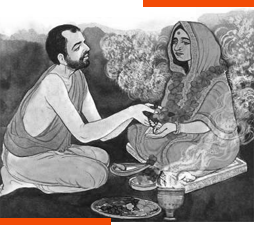 In 1872, his wife Sarada, now nineteen years old, came from the village to meet him. He received her cordially, and taught her how to attend to household duties and at the same time lead an intensely spiritual life. One night he worshipped her as the Divine Mother in his room at the Dakshineswar temple. Although Sarada continued to stay with him, they lived immaculately pure lives, and their marital relationship was purely spiritual. It should be mentioned here that Sri Ramakrishna had been ordained a Sannyasin (Hindu monk), and he observed the basic vows of a monk to perfection. But outwardly he lived like a lay man, humble, loving and with childlike simplicity. During Sri Ramakrishna’s stay at Dakshineswar, Rani Rasmani first acted as his patron. After her death, her son-in-law Mathur Nath Biswas took care of his needs.